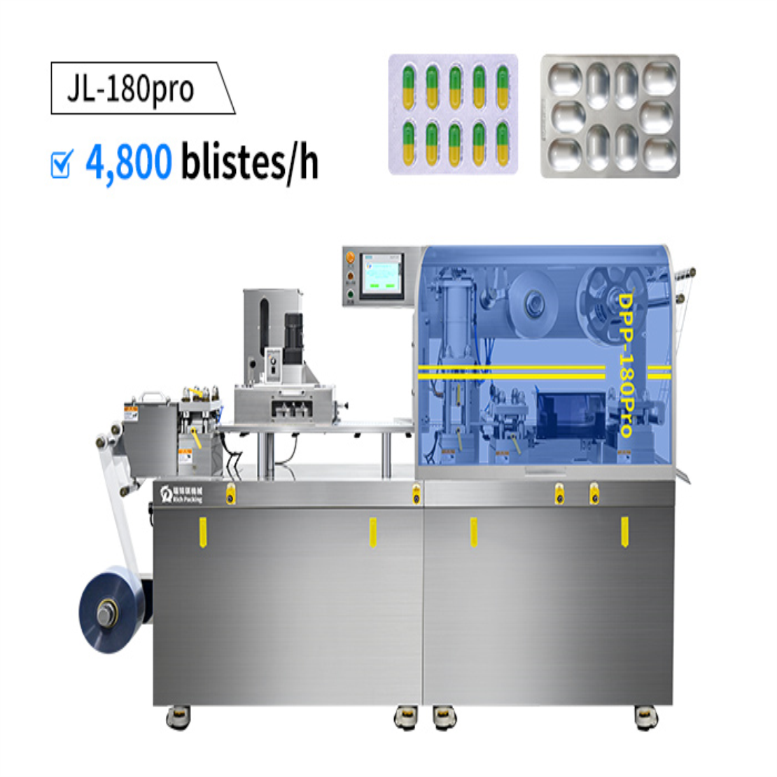 This tablet blister packing machine can automatically seal tablets, capsules and e-cigarettes into aluminum-PVC or aluminum-aluminum blisters, with fully automatic forming, feeding, sealing, cutting and lot coding. DPP180pro adopts a modular structure and flexible adjustment design. It is exported to 85+ countries and regions and has received wide acclaim.